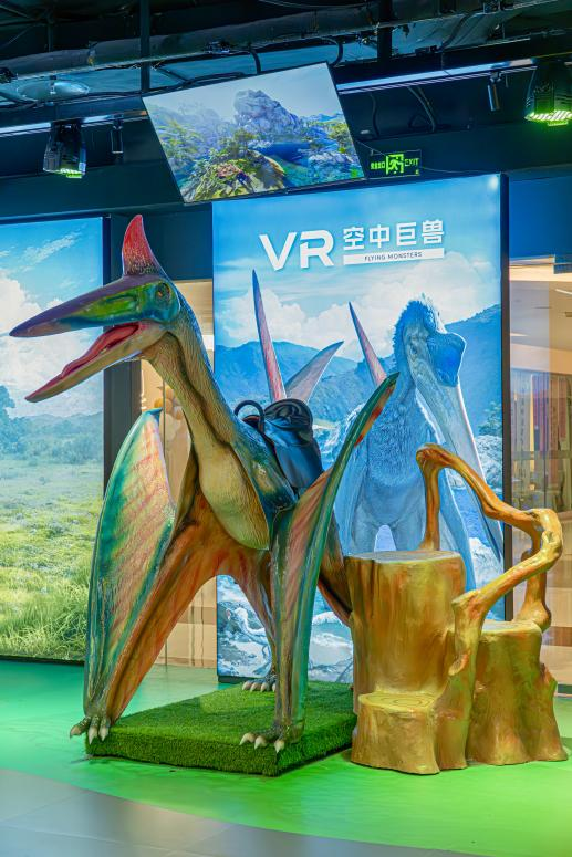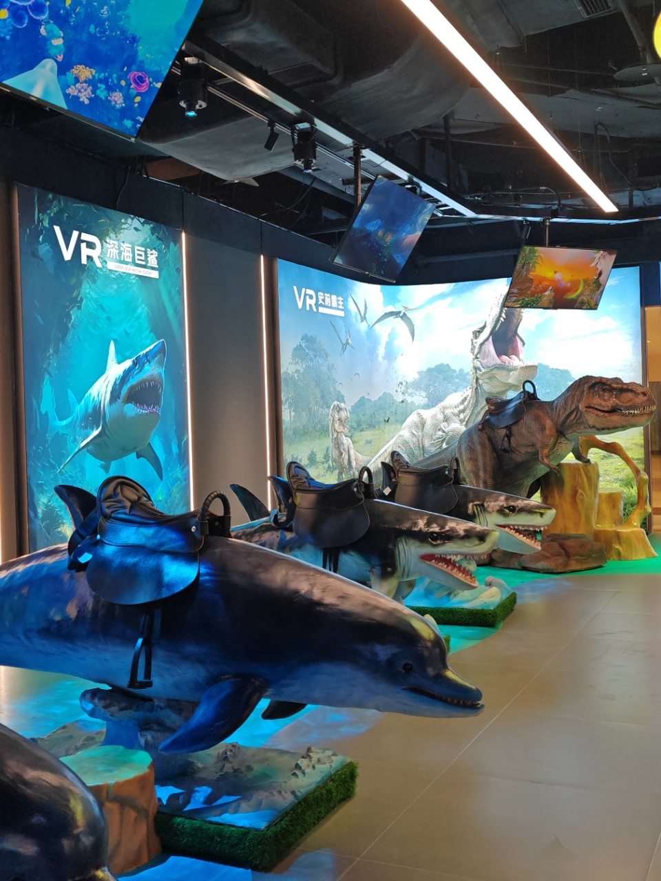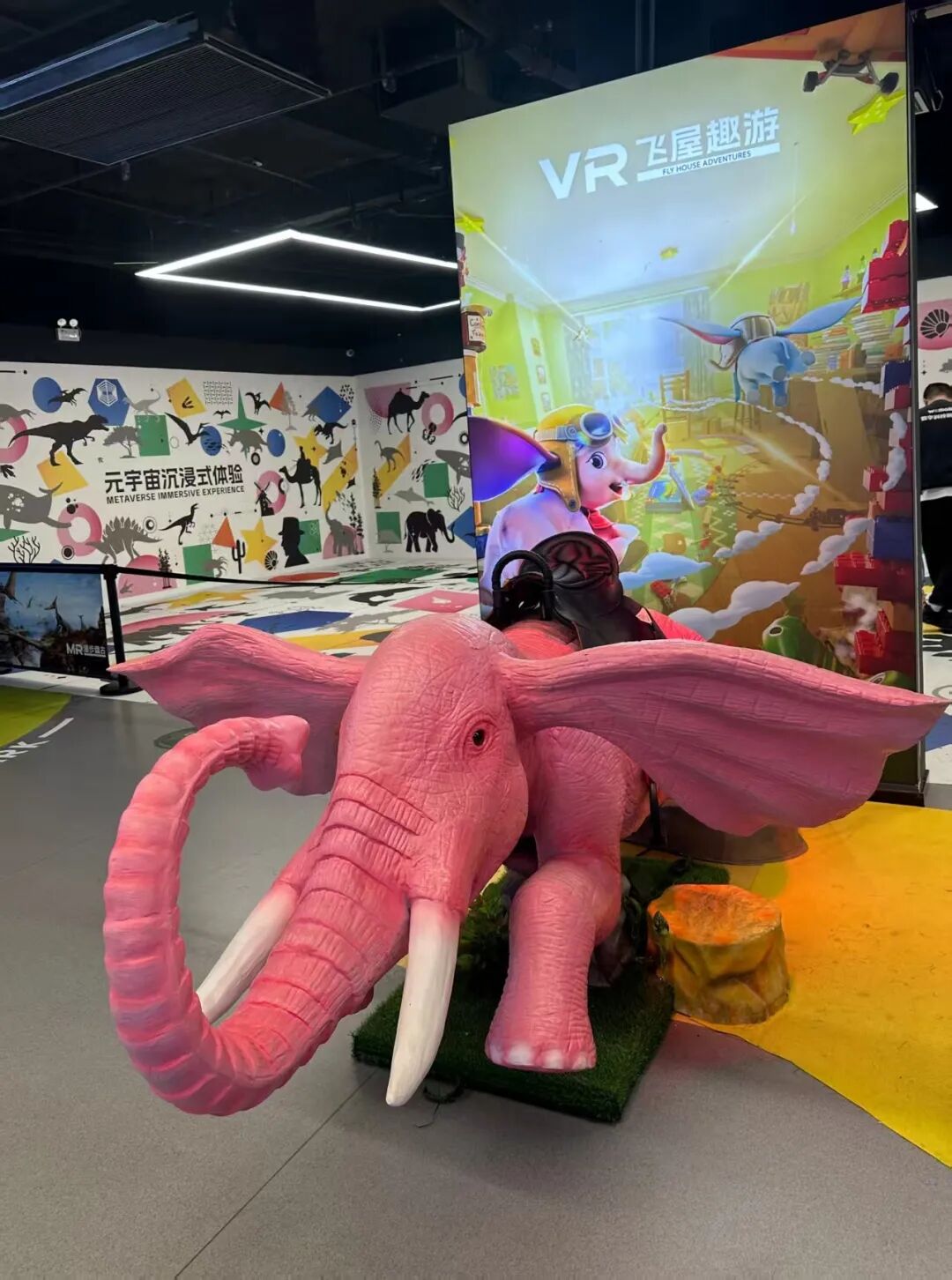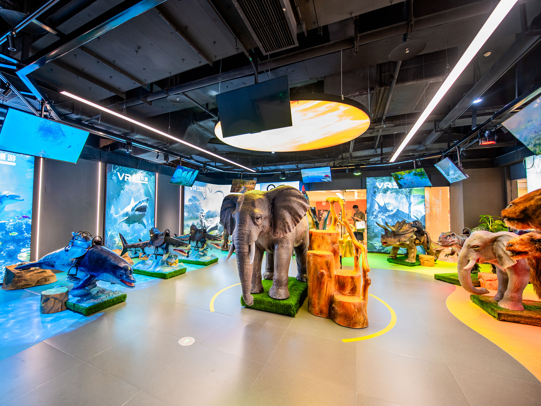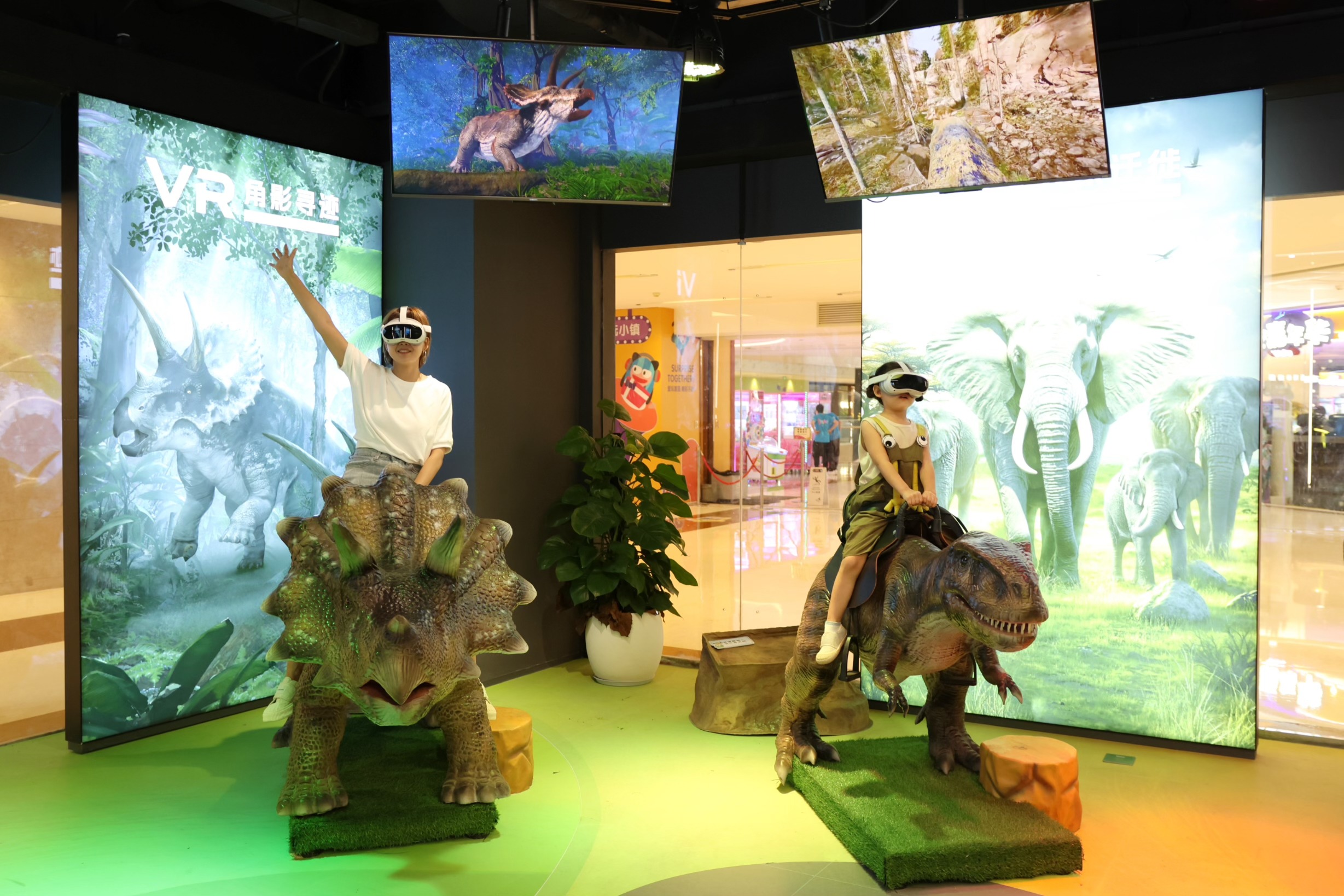 XR 动物乐园将文化旅游、科普教育、娱乐互动深度融合,定制开发了海洋精灵、陆地动物、远古巨兽等多种主题体验内容,借助VR头显和高仿真动物体验外设,可跟随大象的脚步,感受非洲大草原的辽阔与壮美;可以体验骑着海豚潜入大海,畅游奇幻的深海世界;还可以与霸王龙一同穿梭原始丛林,感受亿万年生命的隽永……